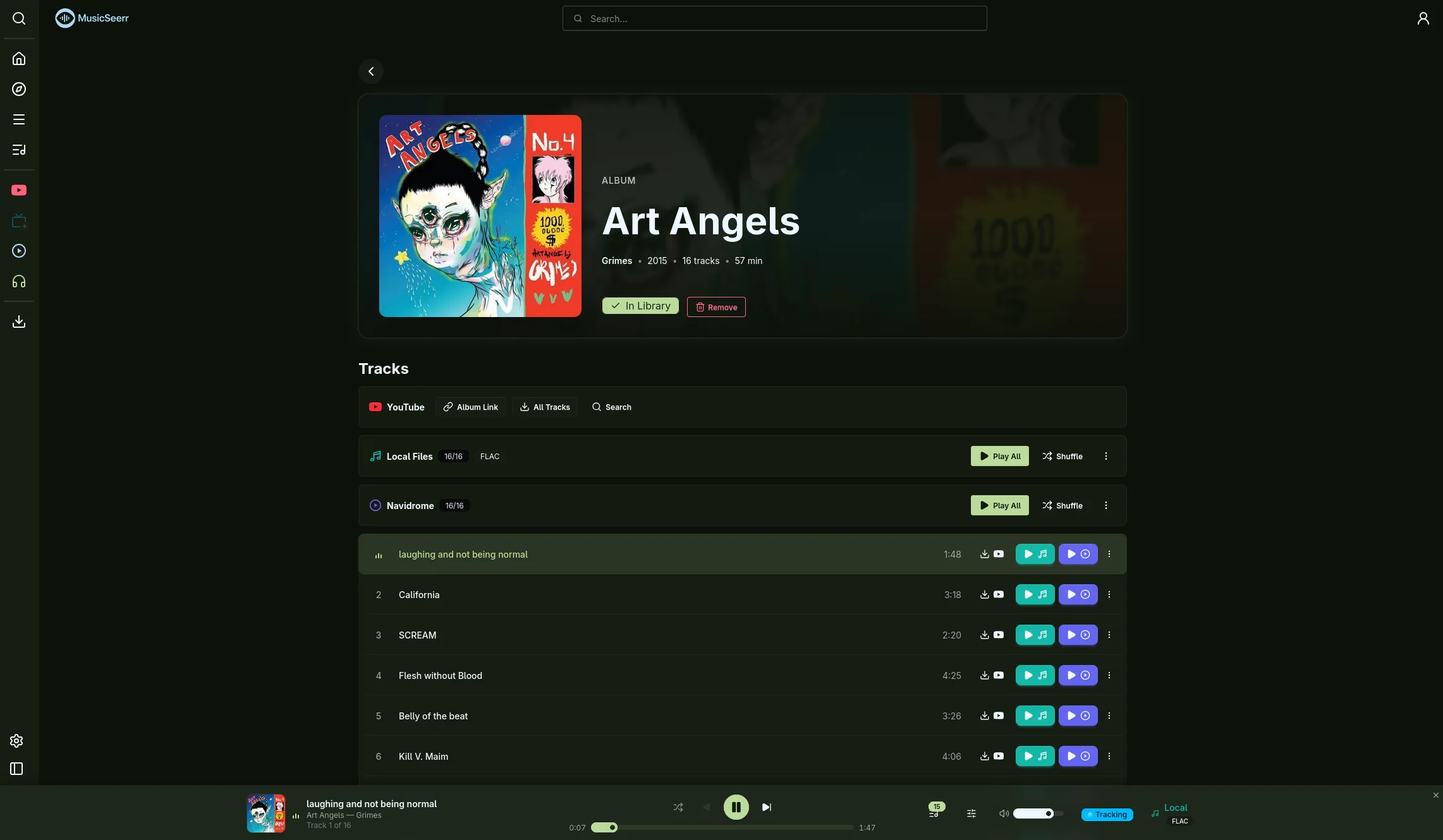 Stream from Jellyfin, Navidrome, local files, or YouTube through a single built-in player. Switch sources per track or let MusicSeerr pick the best one available.
