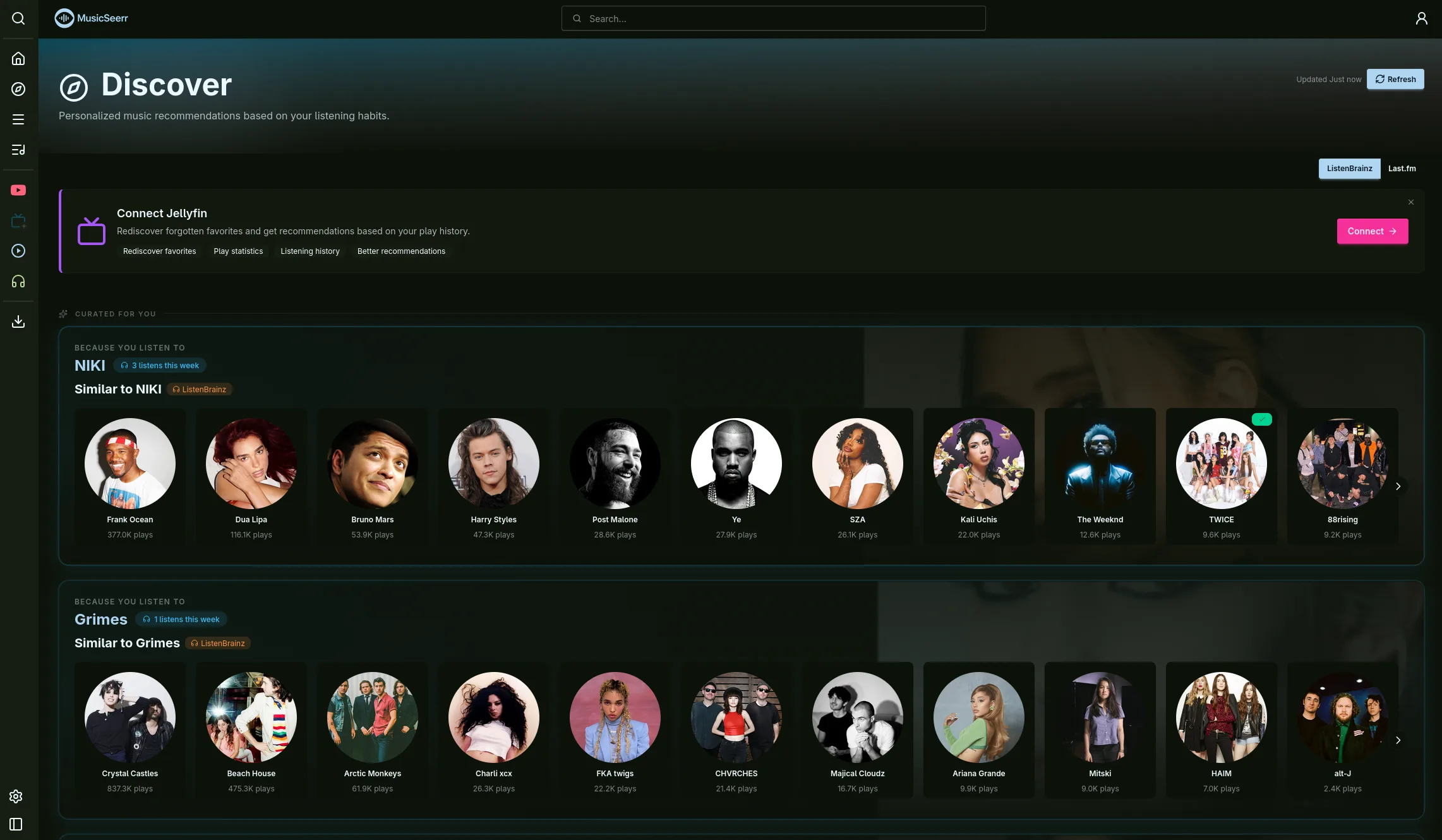 A self-hosted music management and discovery platform that connects Lidarr, Jellyfin, Navidrome, Last.fm, ListenBrainz, and more into one place.